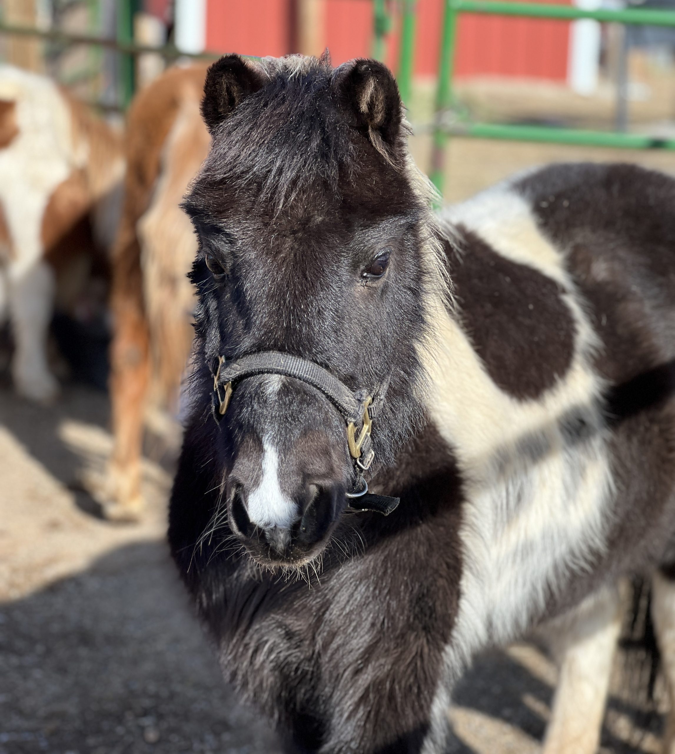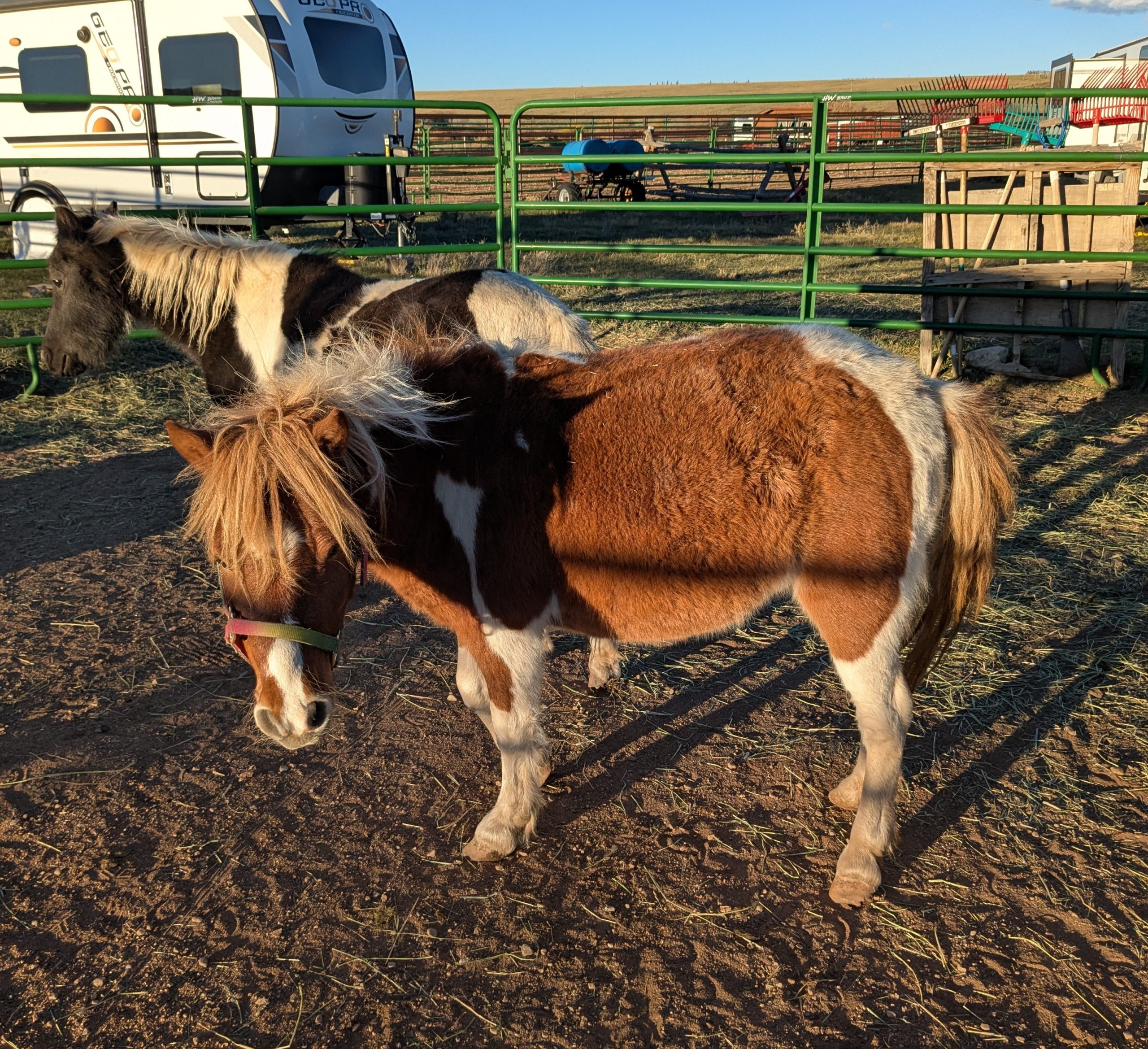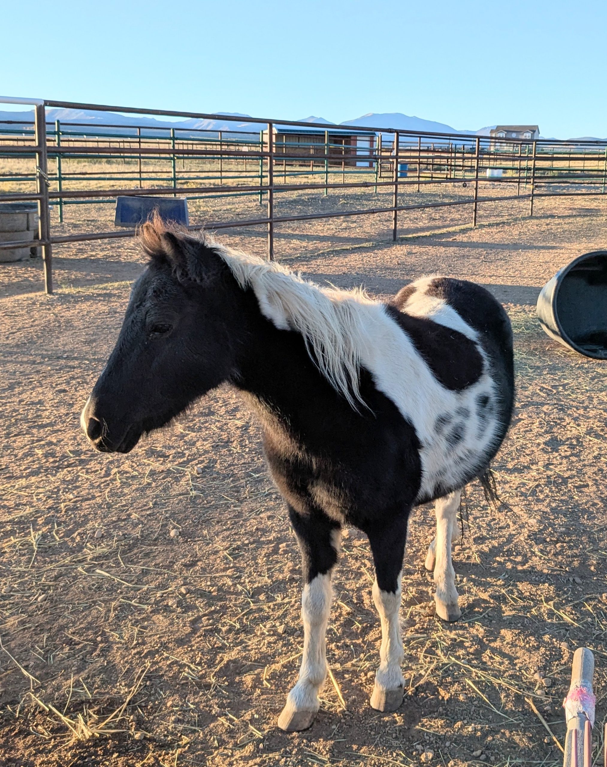 This bonded pair that came to us from another CO rescue with 2 other friends. Originally coming from an auction situation, they were quite scared when we got them in the Fall of 2022. They will need someone that has experience and confidence to catch, halter and lead safely. With some months of positive reinforcement underway, they have begun to trust us humans and will take some time to build those connections and relationships. Oreo now has some basic foundational skills and is doing obstacle work and Peaches is really beginning to trust us humans! At this point in their training, we feel they would benefit from being together in a home
