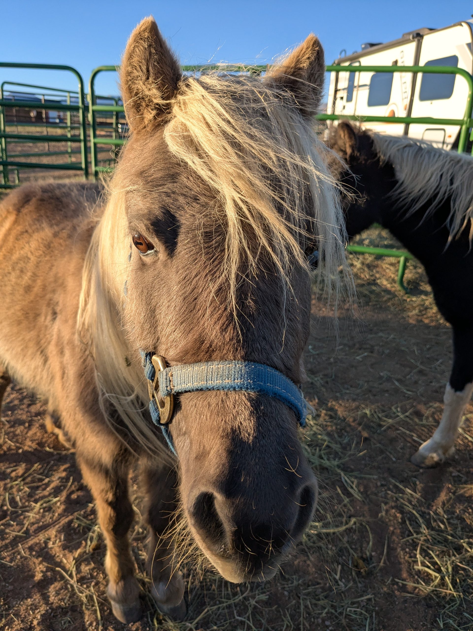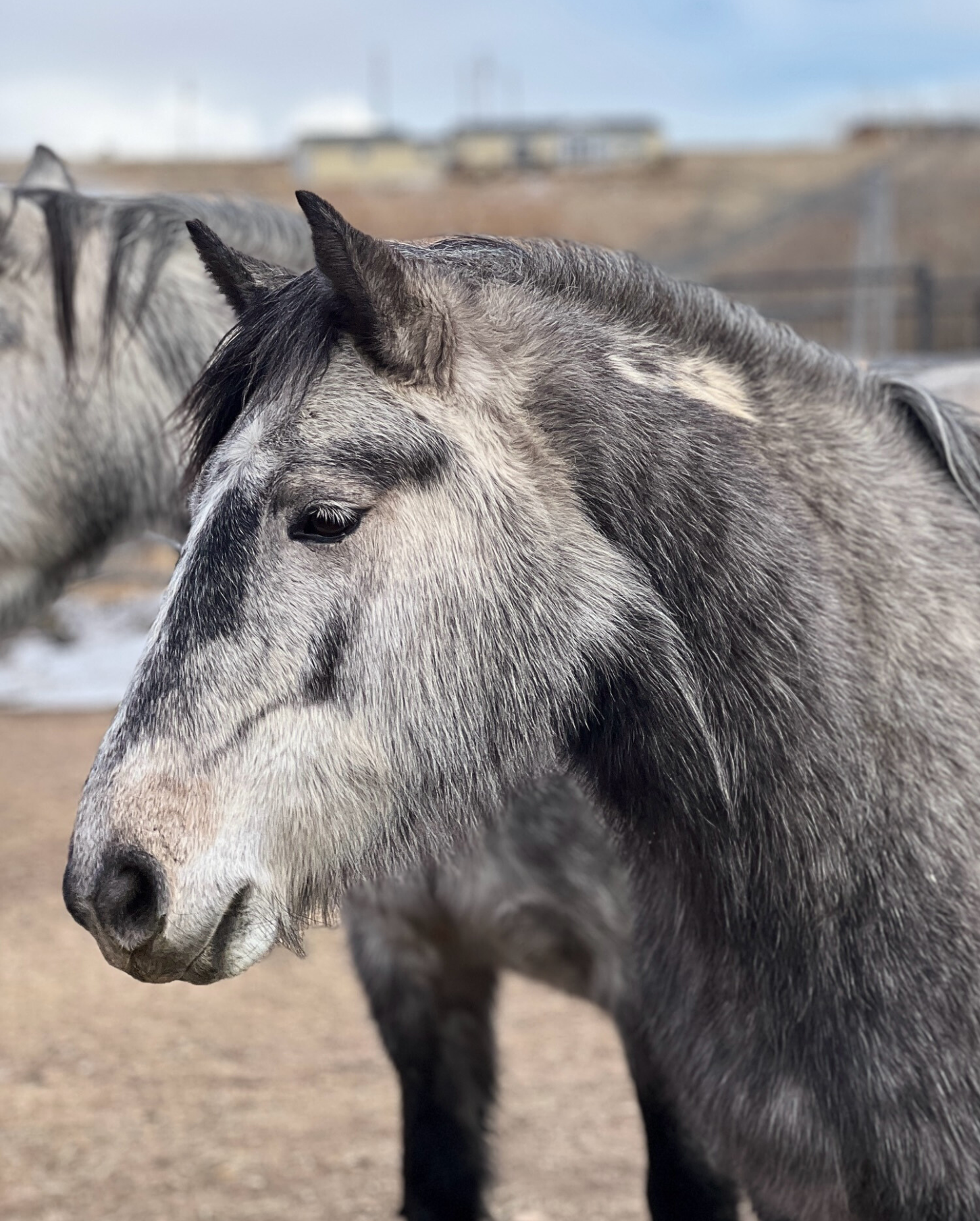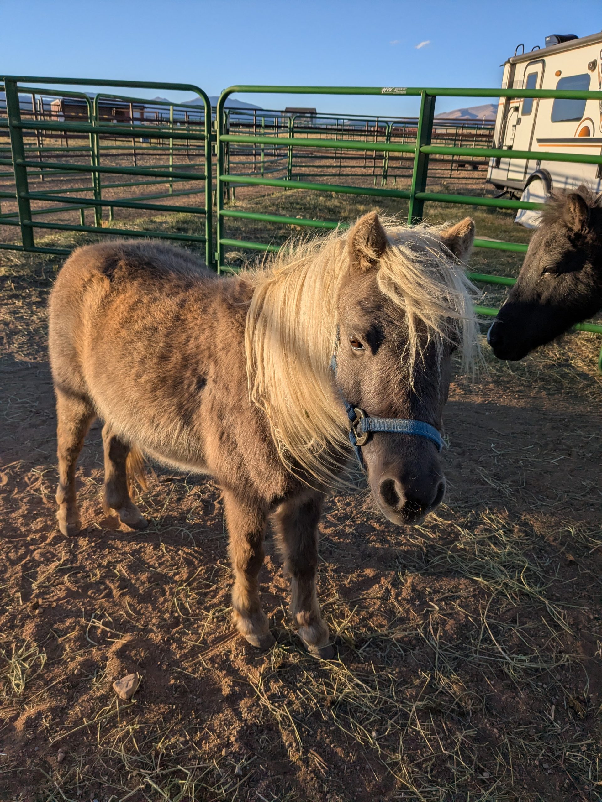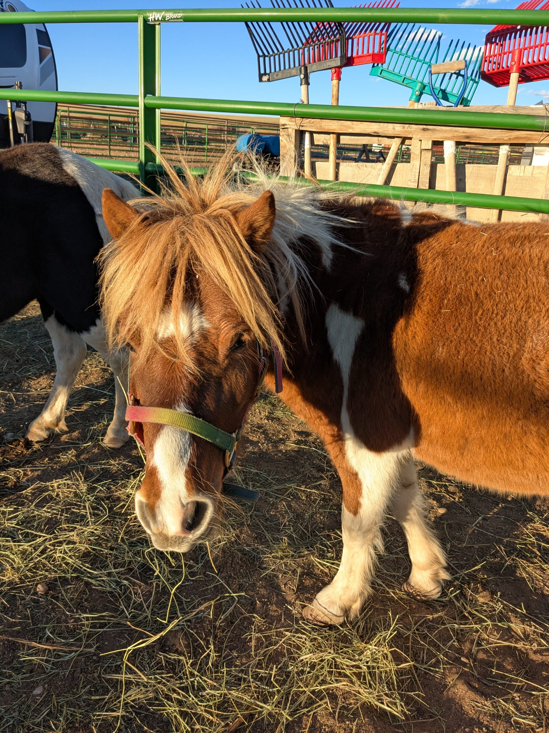 This bonded pair that came to us from another CO rescue with 2 other friends. Originally coming from an auction situation, they were quite scared when we got them in the Fall of 2022. They will need someone that has experience and confidence to catch, halter and lead safely. With some months of positive reinforcement underway, they have begun to trust us humans and will take some time to build those connections and relationships. Oreo now has some basic foundational skills and is doing obstacle work and Peaches is really beginning to trust us humans! At this point in their training, we feel they would benefit from being together in a home